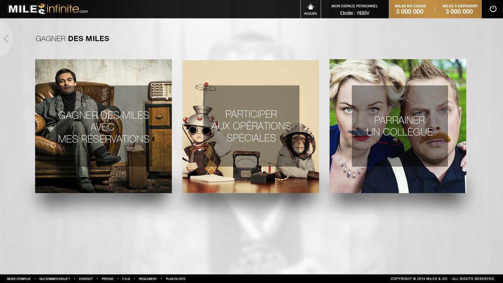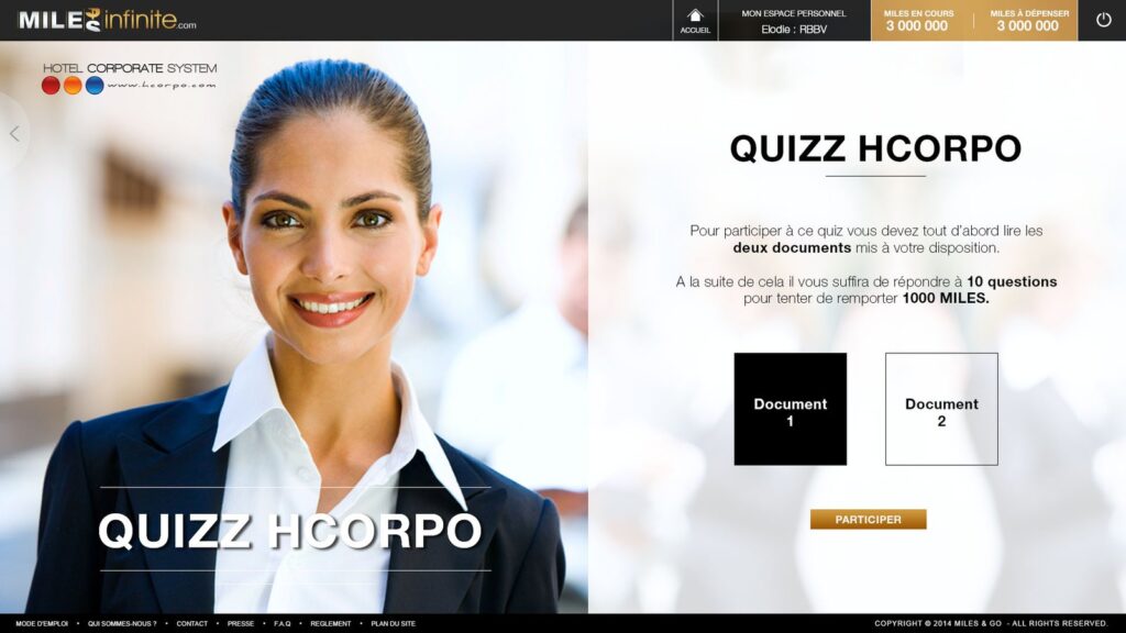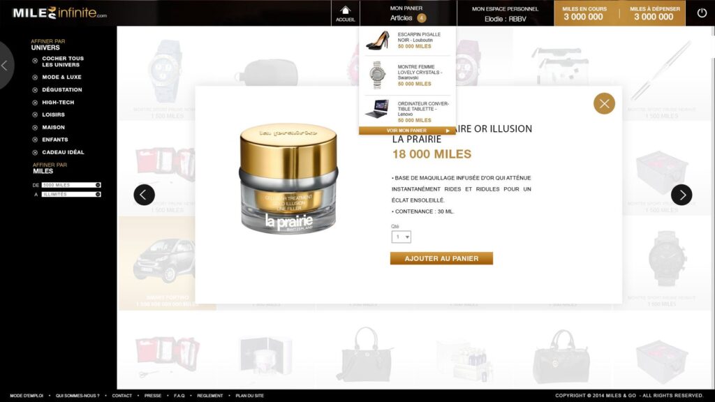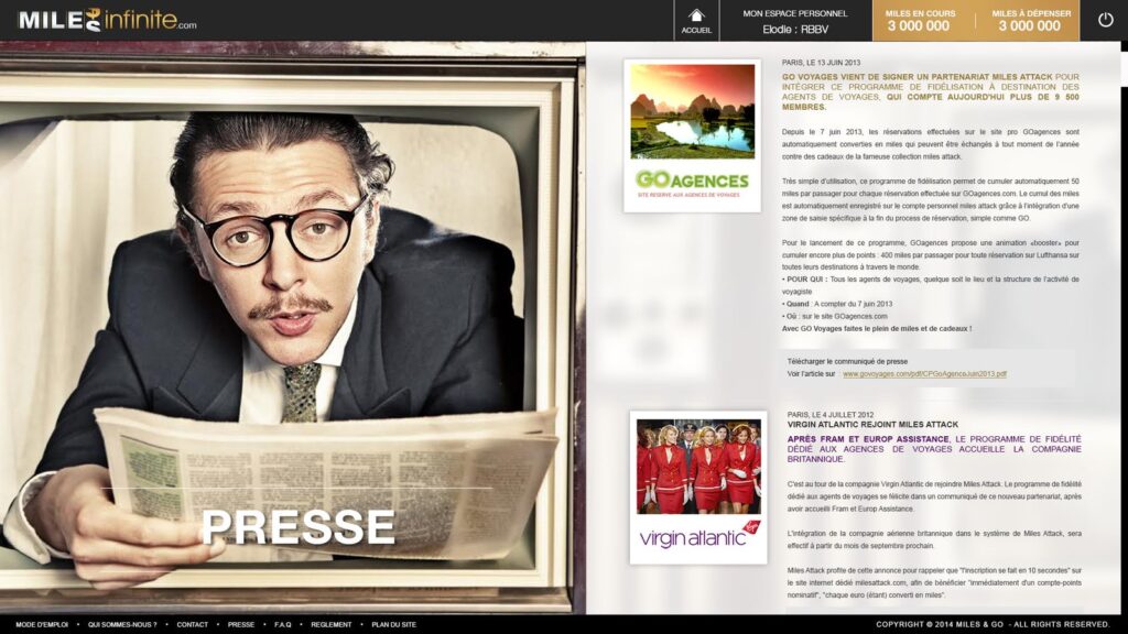 Miles infinite est un programme d’incentive du groupe Gekko Holding, dédiés aux voyageurs d’affaires. La réalisation des maquettes de la plateforme en 2012 a été une expérience créative formidable.